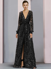 A-Linien-Kleid für die Mutter der Braut, Hochzeitsgast, elegant, funkelnd und glänzend, V-Ausschnitt, bodenlang, Spitze, Pailletten, lange Ärmel mit Pailletten-Applikationen, geschlitzte Vorderseite - US 2 / UK 6 / EU 32