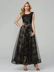 A-Linien-Kleid mit offenem Rücken, bodenlang, ärmellos, Rundhalsausschnitt, Tüll mit Applikationen