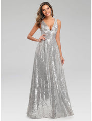 A-Linien-Ballkleider, funkelndes Kleid für Hochzeitsgäste, Verlobung, bodenlang, ärmellos, V-Ausschnitt, Polyester, V-Rücken mit Pailletten