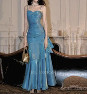 A-Linie Spaghettiträger Blau Rüschen Abendkleider Brautjungfernkleider Abendkleid Ballkleid
