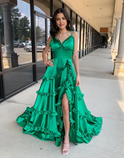A-Linie Spaghettiträger Rüschen Satin Grün Lange Abendkleider Abendkleid Ballkleid mit Schlitz