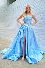 A-Linie, trägerlos, bezauberndes hellblaues Satin-Ballkleid mit Hofschleppe und Schleife