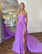 A-Linie, trägerlos, gerüscht, ausgehöhlt, lila, lange Abendkleider, Abendkleid, Ballkleid mit Schlitz