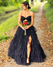 A-Linie Trägerlos Stufen Tüll Schwarz Lange Abendkleider Abendkleid Ballkleid mit Schlitz