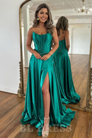 A-Linie Trägerlos Reißverschluss Hinten Lang Satin Grün Abendkleider Abendkleid Ballkleid Mit Schlitz