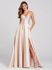 A-Linie V-Ausschnitt Rückenfrei Ärmellos Geteilte Satin-Vorderseite Abendkleider Brautjungfernkleider Abendkleid Ballkleid