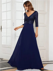 Elegantes A-Linien-Maxikleid mit V-Ausschnitt und langen Ärmeln und Pailletten aus Chiffon, formelle Kleider, Abendkleid, Ballkleid