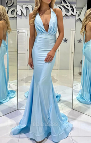 Meerjungfrau Deep V Neckholder Blau Lange Abendkleider Brautjungfernkleider Abendkleid Ballkleid mit rückenfreiem