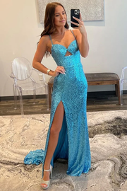 Meerjungfrau Pailletten Schlüsselloch Träger Königsblau Lange Abendkleider Brautjungfernkleider Abendkleid Ballkleid mit Schlitz