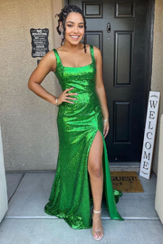 Meerjungfrau Pailletten Square Neck Grün Lange Abendkleider Brautjungfernkleider Abendkleid Ballkleid mit Schlitz