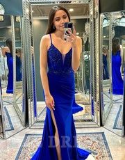 Meerjungfrau Spaghetti Sparkly Royal Blue Straps Korsett Applikationen Lange Abendkleider Abendkleid Ballkleid mit Schlitz