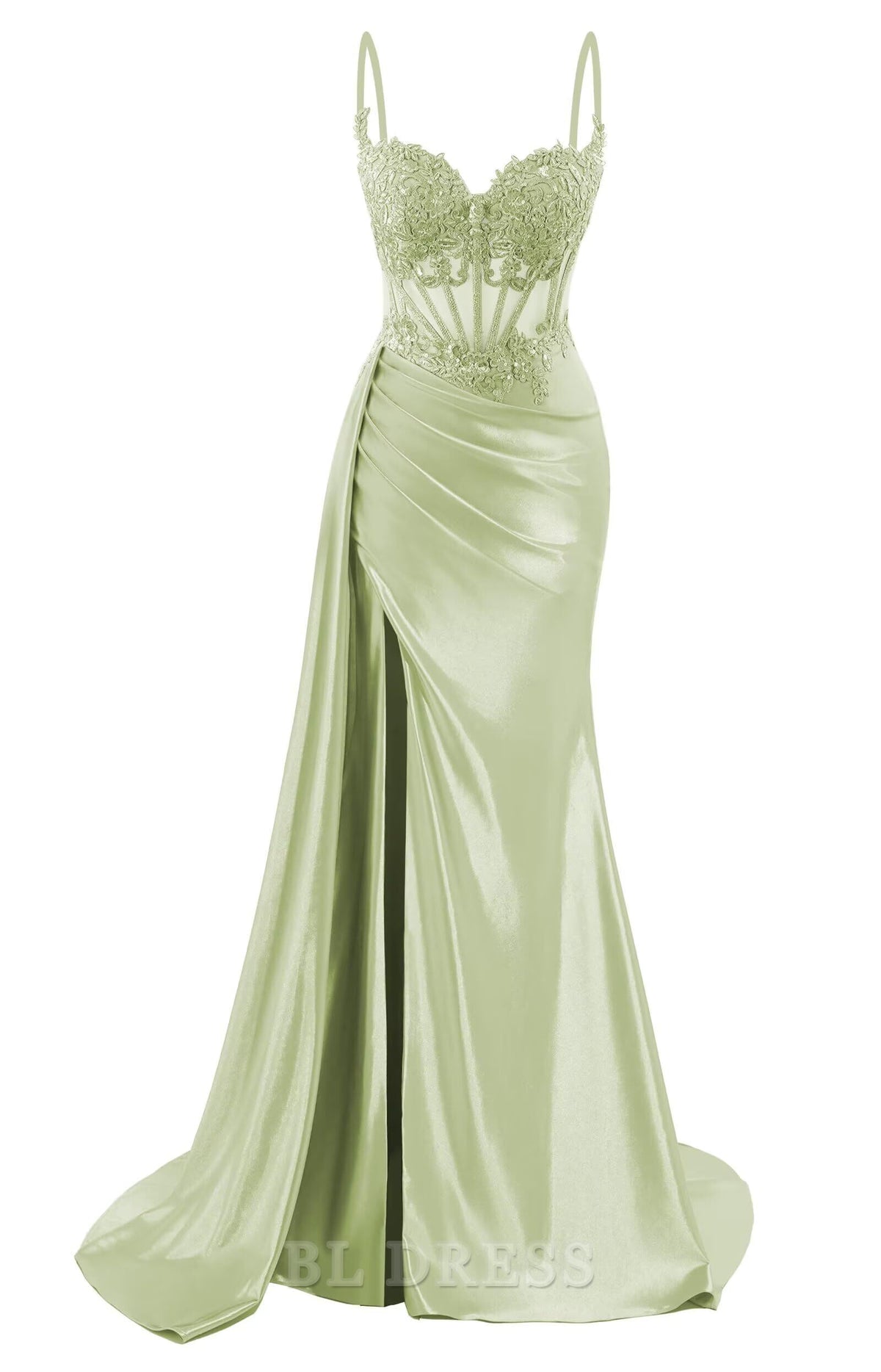 Meerjungfrau Spaghettiträger Spitzenapplikationen Satin Lange Abendkleider Brautjungfernkleider Abendkleid Ballkleid