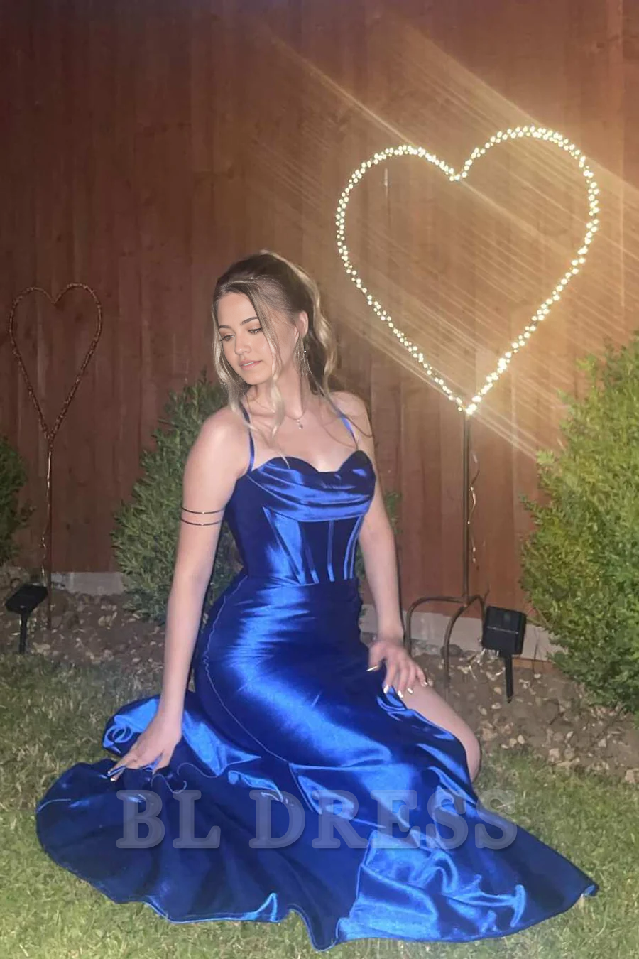 Meerjungfrau Spaghettiträger Plissee Satin Ärmellos Lange Abendkleider Abendkleid Ballkleid