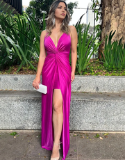 Meerjungfrau Spaghettiträger gerüscht Satin Fuchsia Lange Abendkleider Abendkleid Ballkleid mit Schlitz