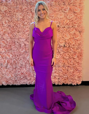 Meerjungfrau Spaghettiträger Satin Langes Pink Abendkleid Brautjungfernkleid Abendkleid Ballkleid mit geschwungener Schleppe