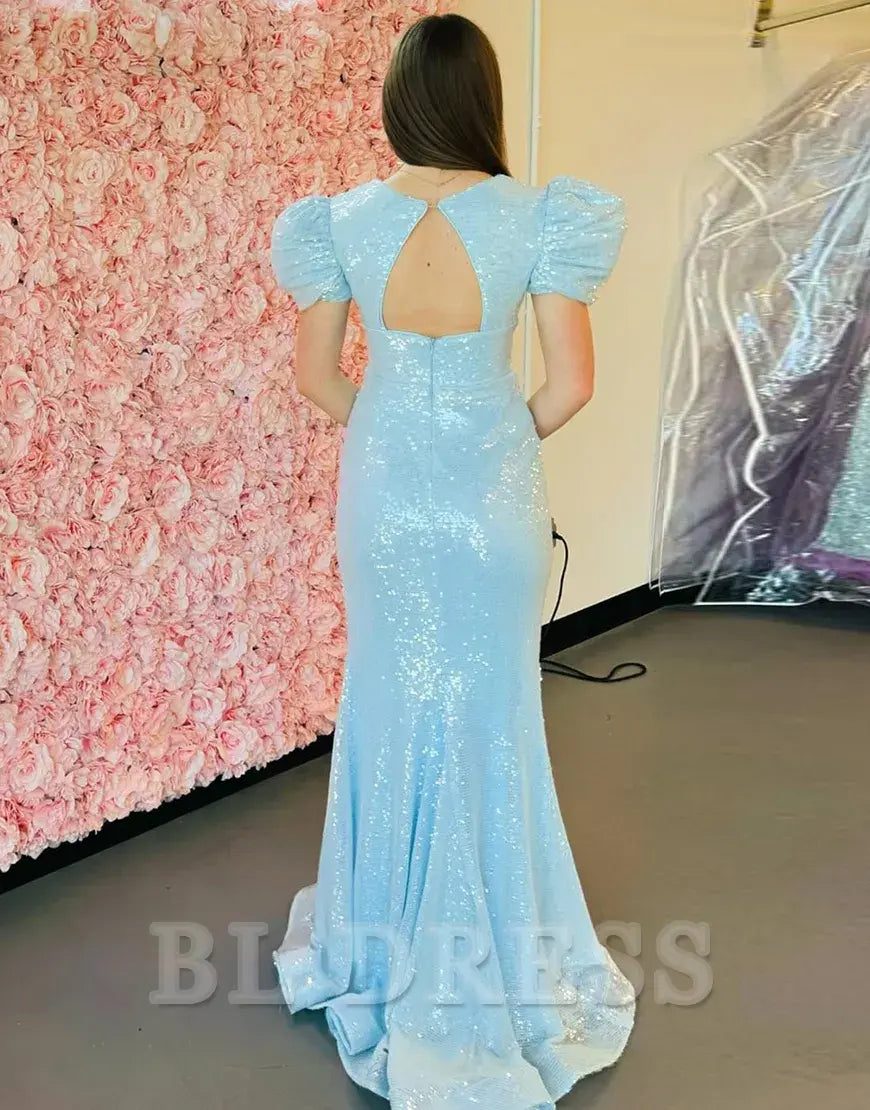 Meerjungfrau Glitzernde Puffärmel Pailletten Blau Lange Abendkleider Brautjungfernkleider Abendkleid Ballkleid mit Schlitz