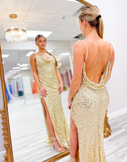 Meerjungfrau Glitzernde Spaghettiträger Pailletten Gold Lange Abendkleider Abendkleid Ballkleid mit Schlitz