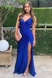 Meerjungfrau Trägerloses Königsblau Lange Abendkleider Brautjungfernkleider Abendkleid Ballkleid mit Schlitz