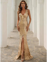 Meerjungfrau/Trompete Abendkleid Elegantes Kleid Formal Sweep/Pinselzug Ärmellos V-Ausschnitt Stretchstoff mit Pailletten