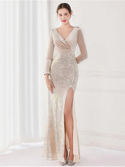 Meerjungfrau/Trompete Abendkleid Elegantes Kleid Hochzeitsgast Bodenlang Langarm V-Ausschnitt Pailletten V-Rücken mit Paillettenschlitz - US 2 / UK 6 / EU 32 / Wie Bild1
