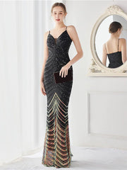 Meerjungfrau/Trompete Abendkleid Elegantes Kleid Hochzeitsgast Bodenlang Ärmellos Spaghettiträger Pailletten V-Rücken mit Pailletten - US 2 / UK 6 / EU 32 / Wie Bild1