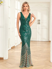 Meerjungfrau/Trompete Abendkleid Glitzerkleid Ballkleid Bodenlang Ärmellos V-Ausschnitt Paillettenbesetzt mit Pailletten