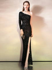 Meerjungfrau/Trompete Abendkleid Glitzerkleid Hochzeitsgast Bodenlang Ärmellos Eine Schulter Pailletten mit Paillettenschlitz