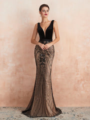 Meerjungfrau/Trompete Luxuriöses Hochzeitsgast-Abendkleid mit V-Ausschnitt, rückenfrei, ärmellos, Pinselschleppe, Samt mit Perlenbesatz