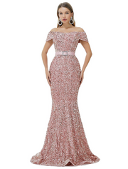 Meerjungfrau/Trompete, funkelnd, figurbetont, Verlobungs- und Abendkleid, schulterfrei, Wasserfallausschnitt, ärmellos, Hofschleppe, mit Pailletten