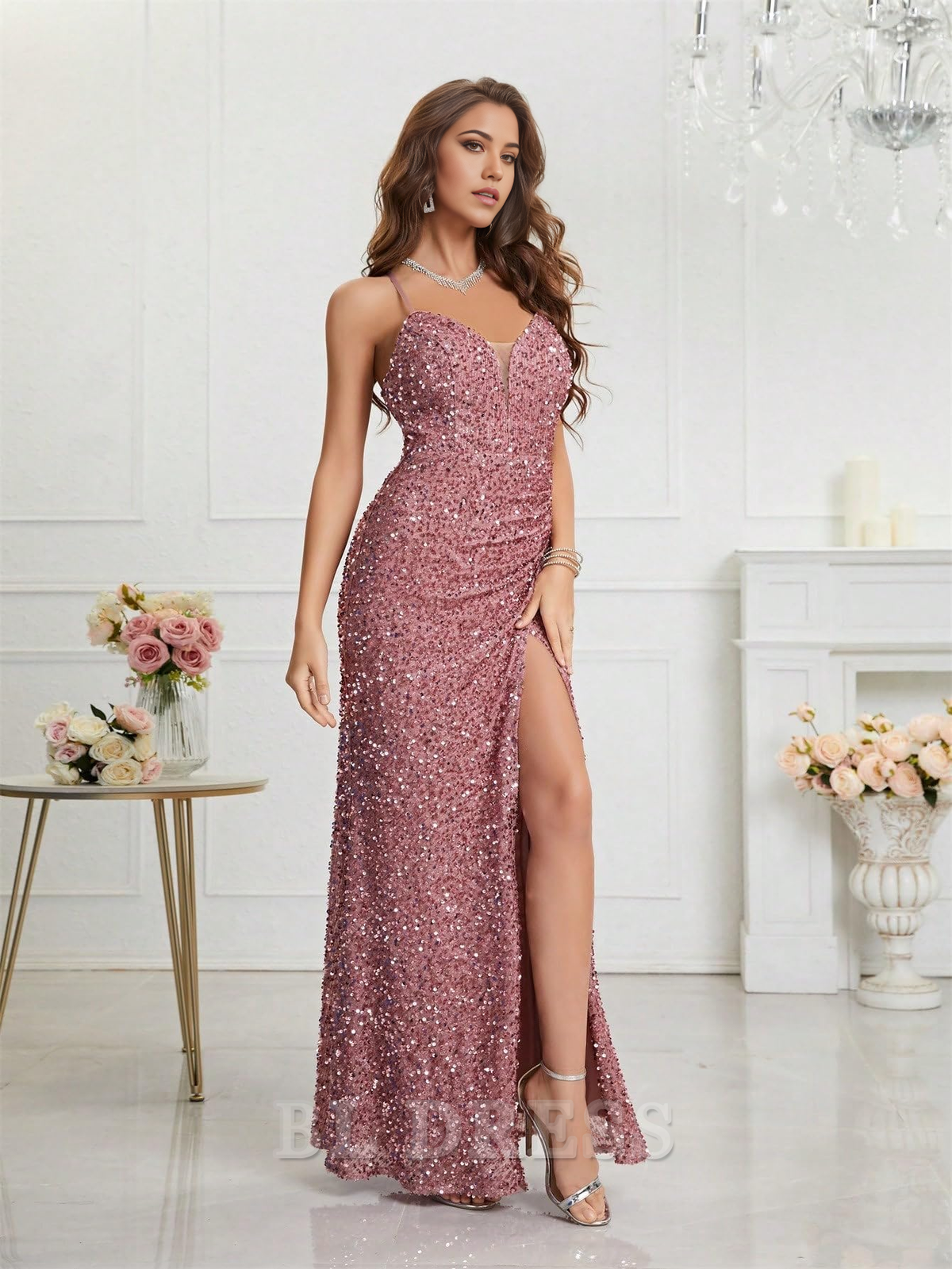 Meerjungfrau V-Ausschnitt Spaghettiträger Bodycon Pailletten Abendkleider Brautjungfernkleider Abendkleid Ballkleid