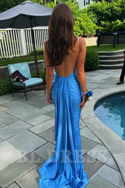 Meerjungfrau V-Ausschnitt Spaghettiträger Ärmellos Satin Blau Lange Abendkleider Abendkleid Ballkleid