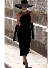 Etuikleid/Säulenkleid, Cocktailkleid, 1950er-Jahre-Kleid, Abendkleid, Partykleid, knielang, ärmellos, eine Schulter, Stretch-Stoff mit Riemchen