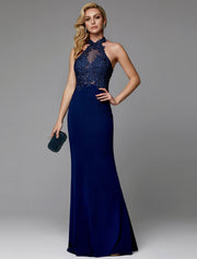 Etuikleid/Säulenkleid, Abendkleid mit Cut-Outs, Hochzeitsgastkleid, bodenlang, ärmellos, Neckholder, Spandex, überkreuzter Rücken mit Applikationen - US 2 / UK 6 / EU 32 / Dunkelblau