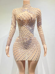 Etuikleid/Säulen-Abendkleid, luxuriöses Kleid, formell, kurz/mini, lange Ärmel, hoher Halsausschnitt, Baumwollmischung mit Kristallen