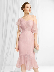Homecoming-Verlobungskleid, V-Ausschnitt, halbe Ärmel, asymmetrische Spitze mit Rüschen
