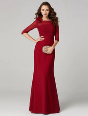 Etuikleid/Säulenkleid mit Schlüssellochausschnitt, bodenlang, 3/4-Ärmel, Bateau-Ausschnitt, Charmeuse mit gerüschter Blume