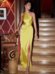 Etuikleid One-Shoulder Satin Knöchellang Plissee Abendkleider Brautjungfernkleider Abendkleid Ballkleid