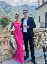 Etuikleid One Shoulder Satin Hot Pink Lange Abendkleider Brautjungfernkleider Abendkleid Ballkleid