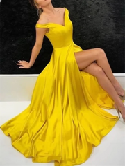 A-Linie, schulterfrei, Satin, lange Ballkleider mit Schlitz