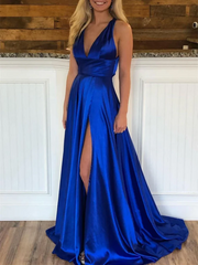 A-Linie, schlicht, V-Ausschnitt, Satin, lang, Ballkleider, formelle Abendkleider mit Schlitz