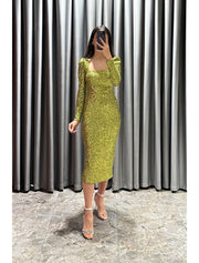 Etuikleid/Säulen-Abendkleid, elegantes schwarzes Kleid, formell, Herbst, knielang, lange Ärmel, quadratischer Ausschnitt, Pailletten mit Glitzerschlitz
