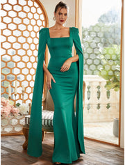 Etuikleid/Säulenkleid, elegantes Abendkleid, formeller Herbst, bodenlang, lange Ärmel, quadratischer Ausschnitt, Stretchstoff mit Falten