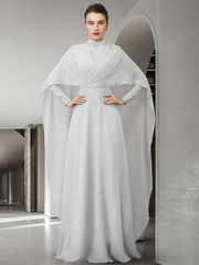 A-Linien-Kleid für die Brautmutter, elegant, hoher Halsausschnitt, Chiffon, Spitze, lange Ärmel mit Faltenapplikationen