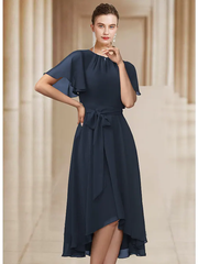 A-Linien-Kleid für die Brautmutter, elegant, Rundhalsausschnitt, asymmetrisch, Chiffon, kurze Ärmel, mit Schleife(n), Falten