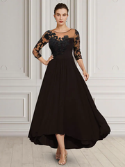 A-Linien-Kleid für die Brautmutter, eleganter Rundhalsausschnitt, asymmetrisch, knielang, Chiffon, Spitze, 3/4-Ärmel mit Applikationen