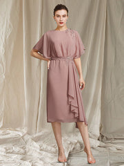 A-Linien-Kleid für die Brautmutter, elegant, mit Rundhalsausschnitt, knielang, Chiffon, kurze Ärmel, mit Schärpe/Band, Perlenapplikationen