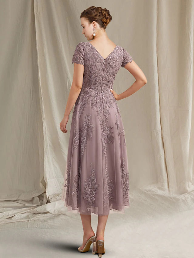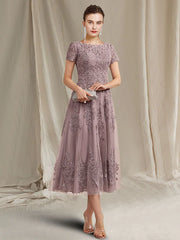 A-Linien-Kleid für die Brautmutter, elegant, mit Rundhalsausschnitt, knielang, Spitze, Tüll, kurze Ärmel mit Applikationen