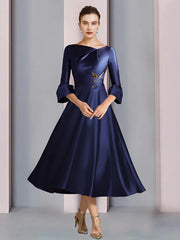 A-Linien-Kleid für die Mutter der Braut, formeller Hochzeitsgast, eleganter U-Boot-Ausschnitt, knielang, Satin, 3/4-Ärmel mit Falten, Perlenbesatz