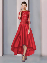A-Linien-Kleid für die Mutter der Braut, formeller Hochzeitsgast, elegant, hoch und tief, U-Ausschnitt, asymmetrisch, knielang, Satinspitze, 3/4-Ärmel mit Applikationen, Rüschen