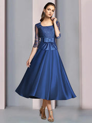 A-Linien-Kleid für die Mutter der Braut, formelle Hochzeitsgastparty, eleganter U-Ausschnitt, knielang, Satinspitze, halbe Ärmel mit Schleife(n)